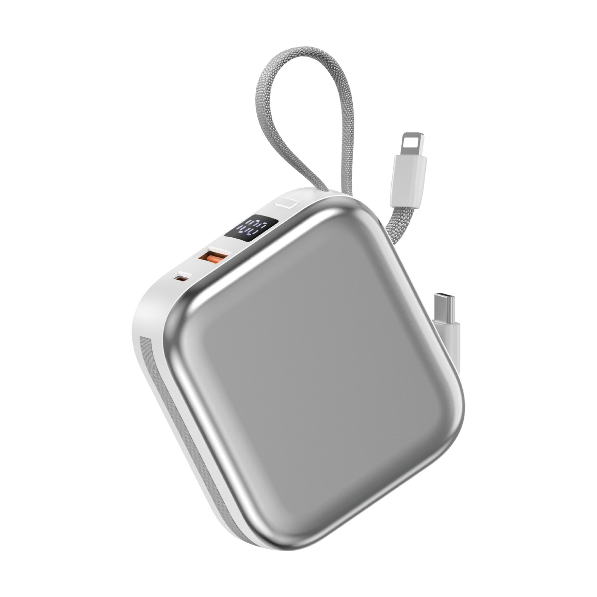 - Ingebouwde kabels – USB-C + Lightning voor direct laden zonder losse kabels