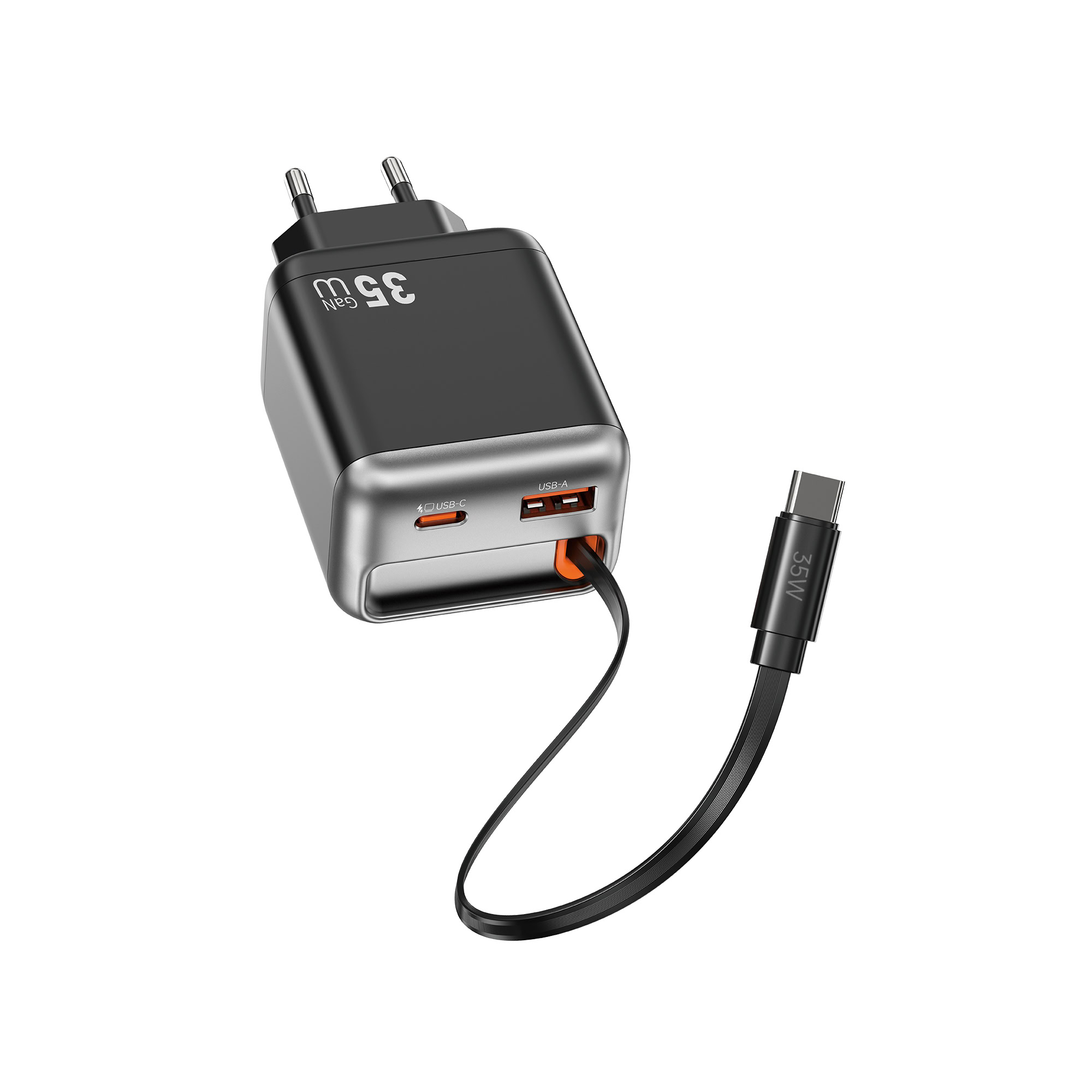 - 1x 35W snellader met ingebouwde oprolbare USB-C kabel